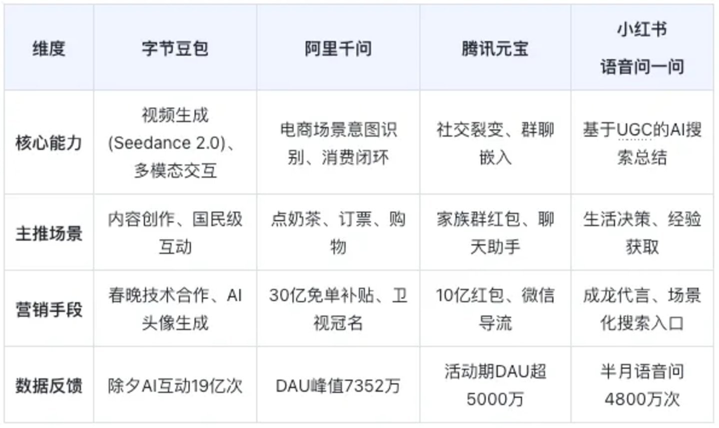 2026年春节AI大战,硝烟尚未散尽。豆包和千问抢占了下载榜前排,元宝挤占私域场景,小红书的“语音问一问”则在用户心中种下一颗关于“活人感”的种子。