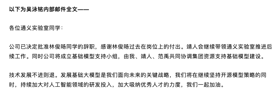 划重点就是,已经批准林俊旸离职,会继续坚持开源策略,加大研发投入和人才吸纳,并成立基础模型支持小组,由吴泳铭,周靖人,范禹共同协调集团资源,支持基础模型建设。