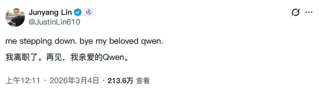 3月4日凌晨,阿里千问大模型负责人林俊旸在 X 发文,宣布离职。