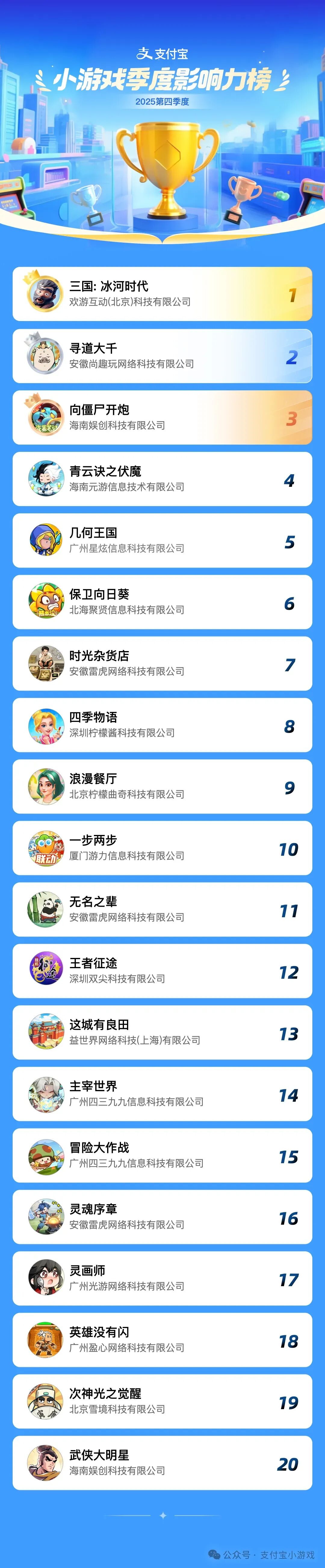 支付宝小游戏平台的生态规模,从 2025 年第四季度发布的两大榜单中可清晰窥见。在影响力榜中,《三国:冰河时代》《寻道大千》《向僵尸开炮》等产品位居前列,研发方涵盖欢游互动、安徽尚趣玩、海南娱创等全国多地的游戏企业,展现出平台吸引优质研发团队入驻、汇聚精品游戏的能力;增速榜则呈现出平台产品的多元发展活力,《口袋奇兵》《龙迹之城》《打个螺丝》等不同类型的休闲小游戏实现快速增长,甚至腾讯欢乐斗地主等经典游戏也位列其中。