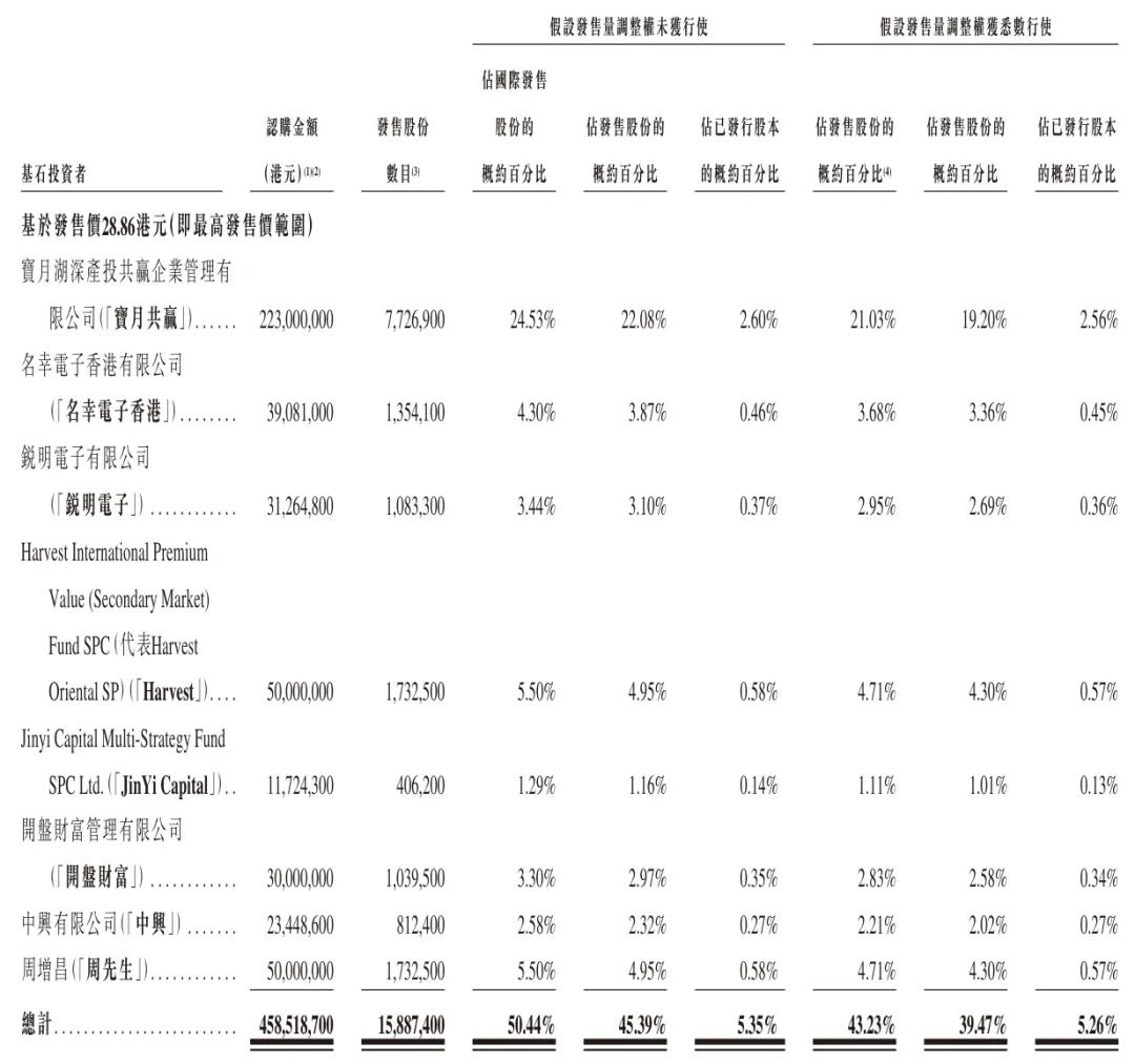 其中,宝月湖深产投共赢企业管理有限公司持股为2.23亿港元,名幸电子香港有限公司认购3908万港元;