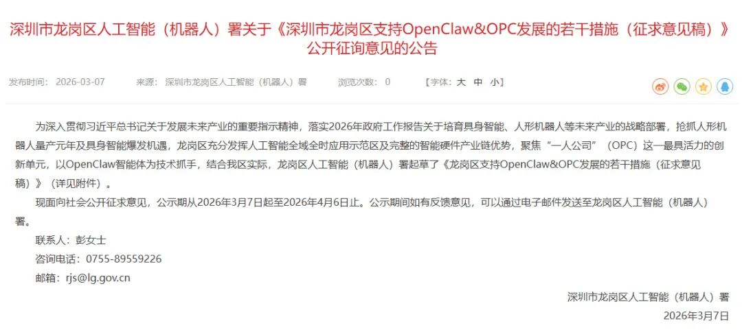 ( IT 之家 )龙岗区发布支持 OpenClaw 与 OPC 发展的征求意见稿,推出十大措施。