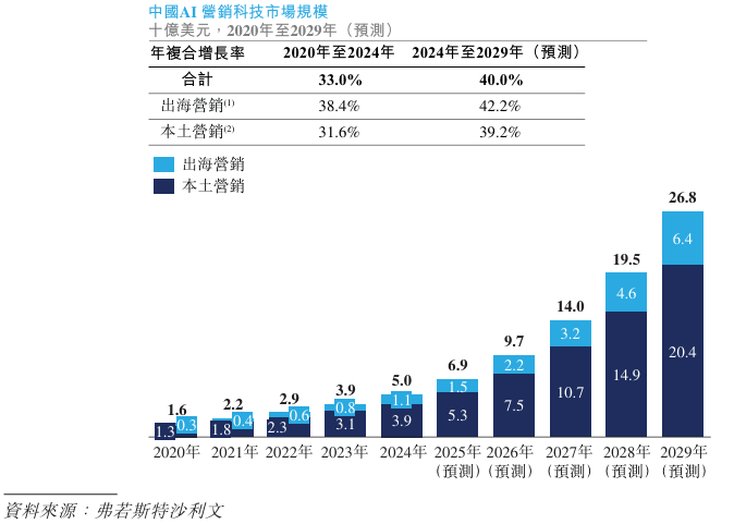 中国AI营销科技市场的市场规模由2020年的16亿美元增至2024年的50亿美元,2020年至2024年的年复合增长率为33.0%。展望未来,中国AI营销科技市场的市场规模预计到2029年将达到268亿美元,2024年至2029年的年复合增长率为40%。