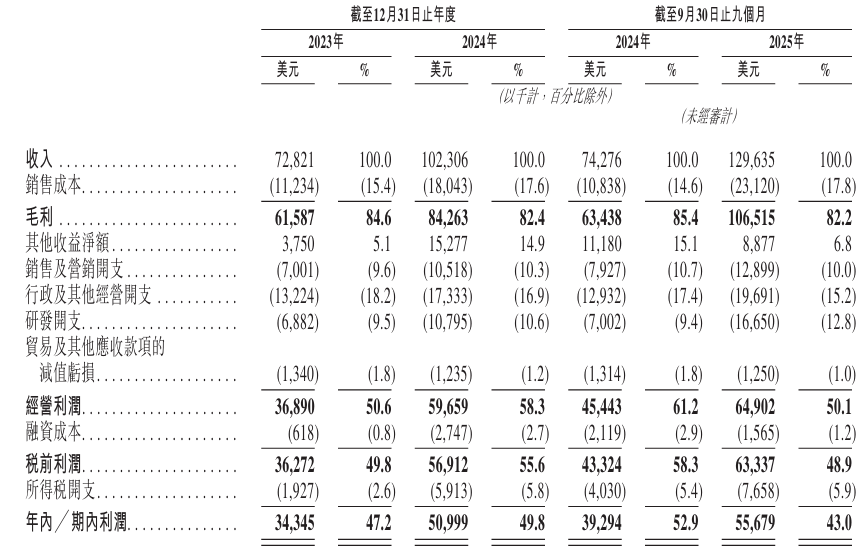 公司于2023年、2024年分别录得收入7282.1万美元,1.02亿美元。2025年首9月,收入同比增长74.53%至1.3亿美元。