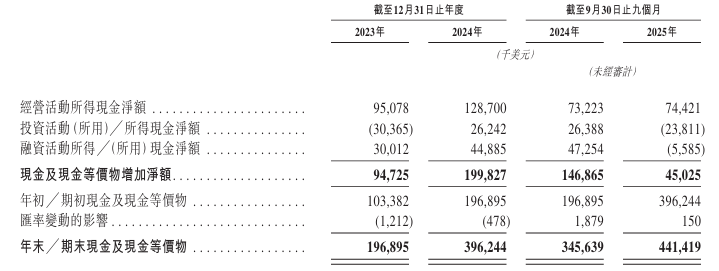 此外,钛动科技是极为罕见高利润、高现金流的AI企业。财务数据显示,截至2025年9月30日止前9个月,公司实现收入1.3亿美元,同比增长74.53%,同时已超过2024年全年收入的1.02亿美元。盈利能力强劲,2025年前9个月实现盈利5567.9万美元,同比增长41.7%,同样超过2024年全年利润5099.9万美元。现金流方面,公司经营活动所得现金净额持续净流入,截至2025年前9月止现金及现金等价物已增至4.41亿美元。