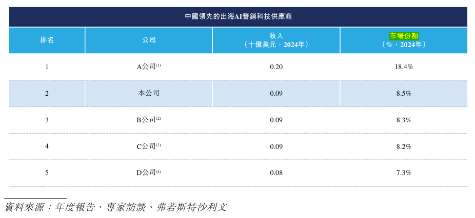 中国AI营销科技市场目前正处于快速发展阶段,导致市场仍相对分散。公司目前在中国整体AI营销科技市场中的市场份额约为2%。按2024年收入计算,公司是中国第二大出海AI营销科技提供商。
