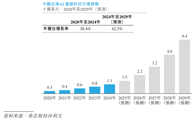 2024年,中国出海AI营销科技市场规模达到11亿美元,预计2029年将增至64亿美元,2024年至2029年的年复合增长率为42.2%。