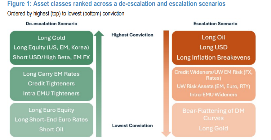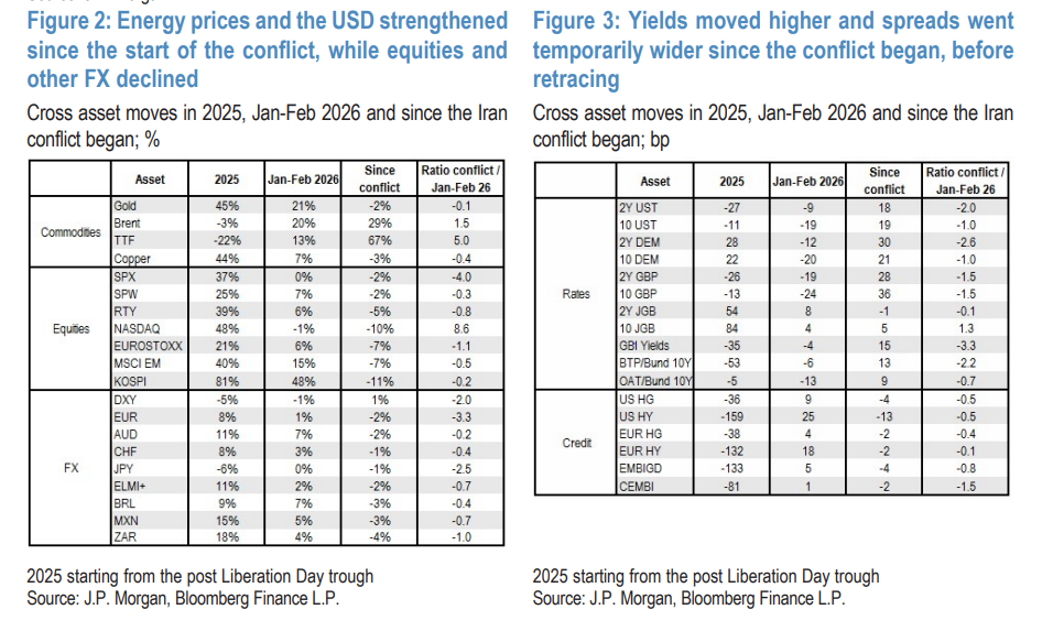 据追风交易台消息,3月6日,摩根大通发布了最新的《全球市场策略》报告。在美以对伊朗发动袭击后,地缘政治瞬间主导了全球宏观定价,市场正严阵以待潜在的通胀和宏观冲击。