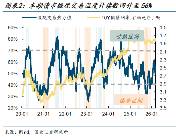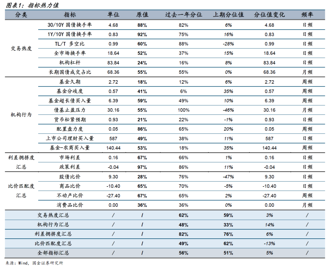 “国金证券固收-债市微观交易温度计”较上期回升5个百分点至56%。本期少数指标分位值回落,分别是股债比价、TL/T多空比、商品比价、货币松紧预期分位值分别下降47、28、5、1个百分点。其余指标分位值不同程度回升,基金分歧度、配置盘力度、基金-中小行买入量分位值上升幅度较大,分别为35、20、35个百分点。当前拥挤度较高的指标包括1/10Y国债换手率、政策利差。