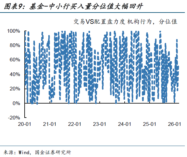 ⑧ 基金vs中小行买入量(中性):本期基金-中小行买入量大幅上升至140亿,对应过去一年分位值上升35个百分点至53%,由偏冷区间升至中性区间。