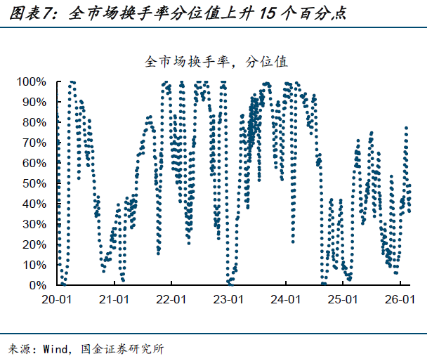 本期交易热度类指标中,位于过热区间的指标数量占比降至33%、位于中性区间的指标数量占比上升至50%,位于偏冷区间的指标数量占比回落至17%。其中仅TL/T多空比分位值下降28个百分点至60%、由过热区间降至中性区间,全市场换手率分位值上升15个百分点至52%、由偏冷区间升至中性区间。