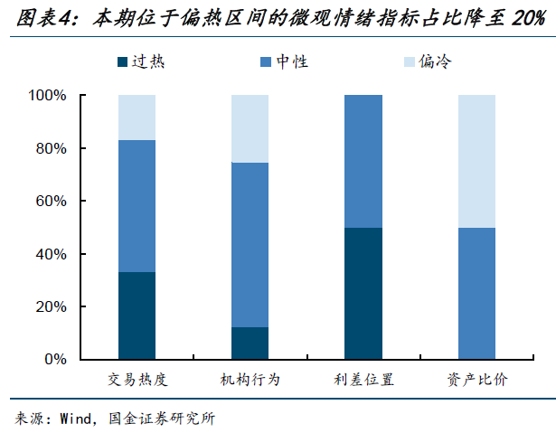 20个微观指标中,位于过热区间的指标数量降至4个(占比20%)、位于中性区间的指标数量升至11个(占比55%)、位于偏冷区间的指标数量降至5个(占比25%)。其中指标所处区间发生变化的是,TL/T多空比、商品比价均由过热区间降至中性区间,股债比价由过热区间降至偏冷区间,全市场换手率、基金分歧度、上市公司理财买入量、基金-中小行买入量均由偏冷区间升至中性区间,配置盘力度由中性区间升至过热区间。