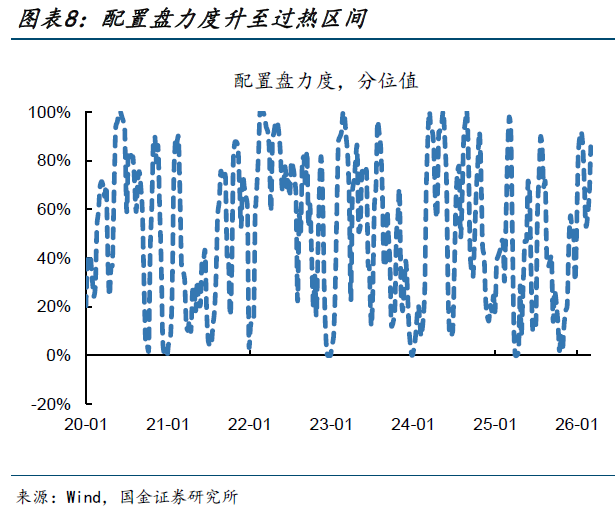 ⑥ 配置盘力度(过热):本期配置盘力度继续上升0.02至0.05,过去一年分位值上升20个百分点至86%,由中性区间升至过热区间。