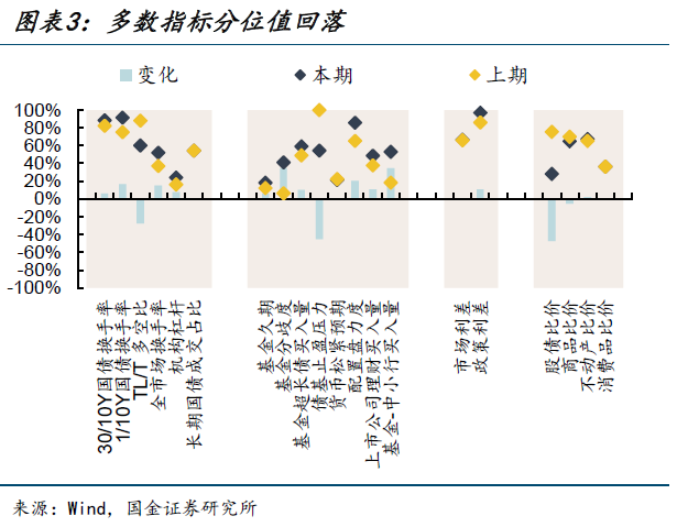 比价分位值转为回落。①交易热度中,仅TL/T多空比分位值回落28个百分点,其余指标分位值均回落,其中全市场换手率、1/10Y国债换手率分位值分别上升15、16个百分点,交易热度分位均值上升3个百分点。②机构行为类指标也多回升,仅货币松紧预期分位置小幅上升1个百分点,基金-中小行买入量、基金分歧度、配置盘力度分位值分别上升35、35、20个百分点,带动机构行为分位均值上升14个百分点。③市场、政策利差分位值分别上升1、11个百分点,利差分位均值上升6个百分点。④股债、商品比价分位值分别回落47、5个百分点,比价分位均值下降13个百分点。