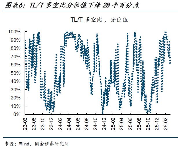 ③ TL/T多空比(中性):本期TL/T多空比小幅回落至0.99,过去一年分位值下降28个百分点至60%,由过热区间降至中性区间。