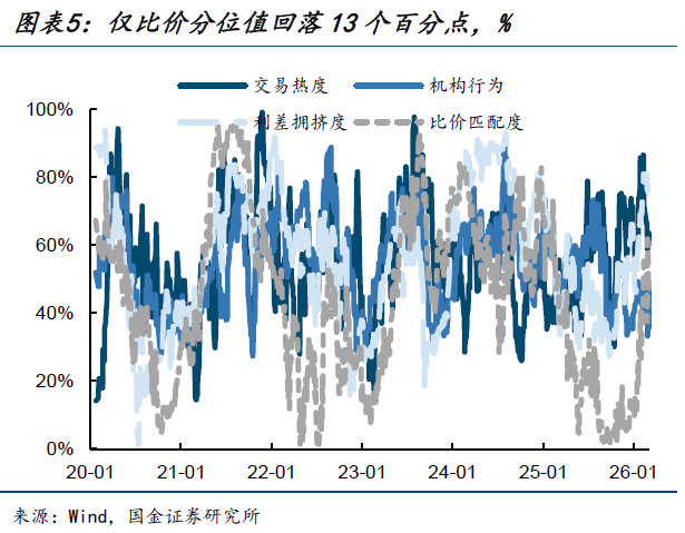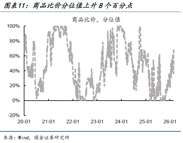 ② 商品比价(过热):本期商品比价回落2个百分点至-10.4%,对应过去一年分位值下降5个百分点至65%。