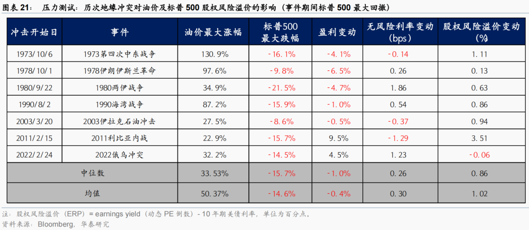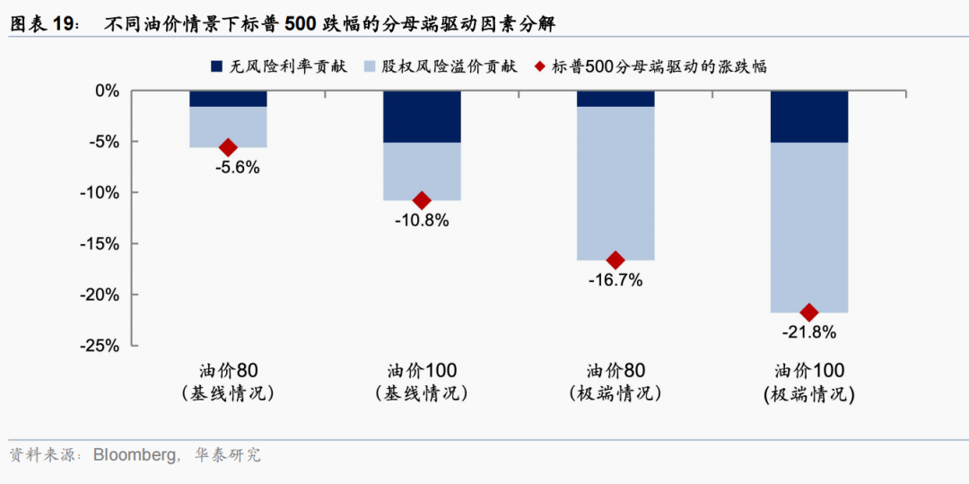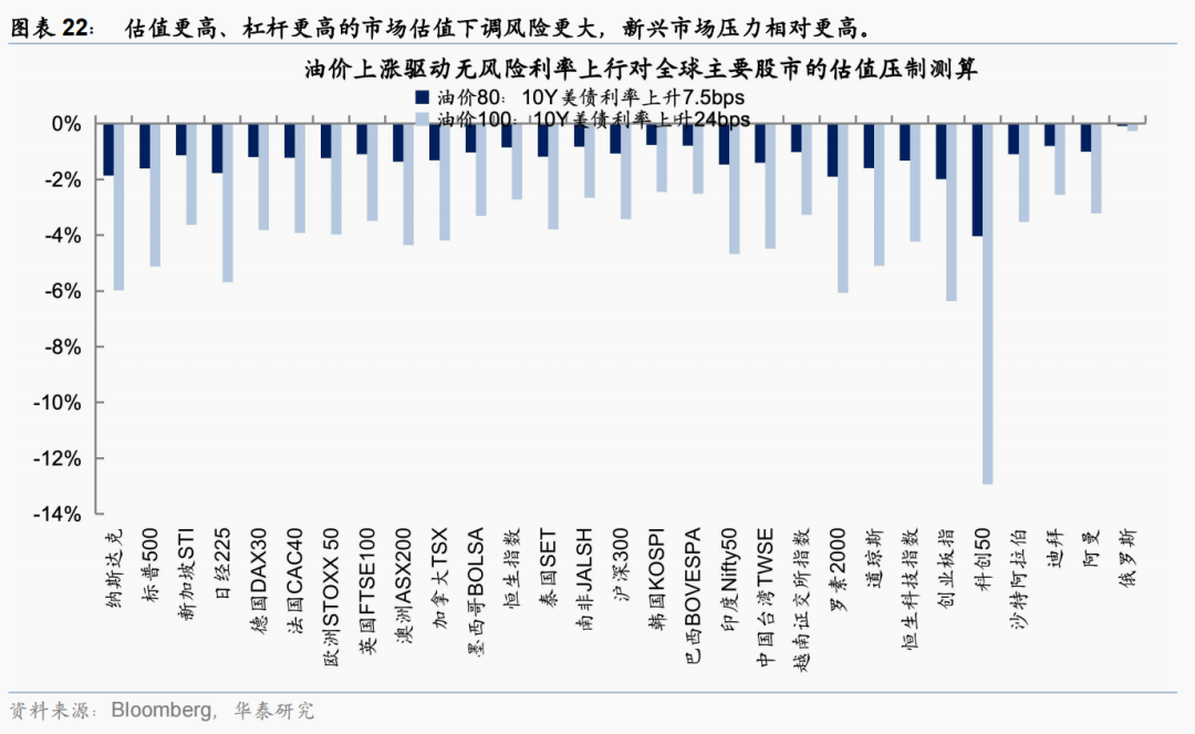 对全球股权而言,分母金融条件紧缩的逻辑是类似的。1)油价上升的持续性增强,通胀预期可能上调,降息预期也可能因此回摆,这导致无风险利率上升。结合宏观和策略组的测算,若油价在80美元/桶,10年美债利率上升7.5bps,美元上升0.6%-2.2%;若油价在100美元/桶,10年美债利率上升24bps,美元上升1.2%-3.5%。2)地缘冲突会通过风险偏好恶化推高股权风险溢价,从而进一步压缩股票估值。以标普500为例,估值回撤中枢在两种情形下分别为5.6%和10.8%,最大回撤的压力测试更高。普遍来说,估值更高、杠杆更高的市场估值下调风险更大,新兴市场压力相对更高。