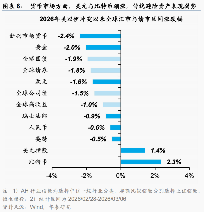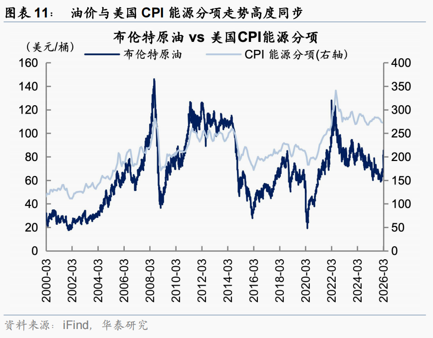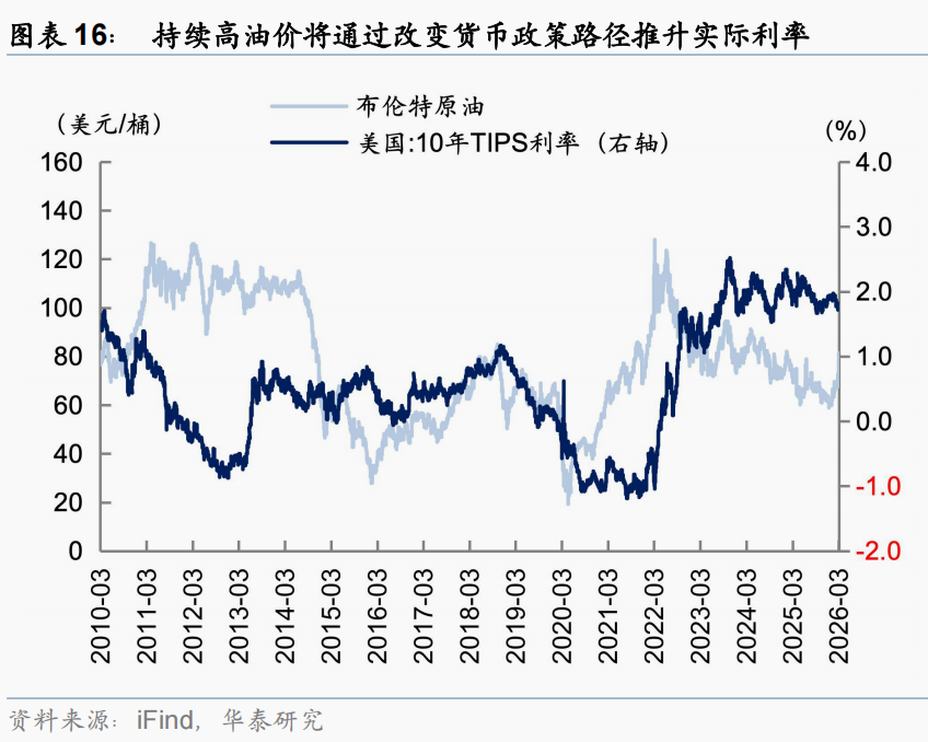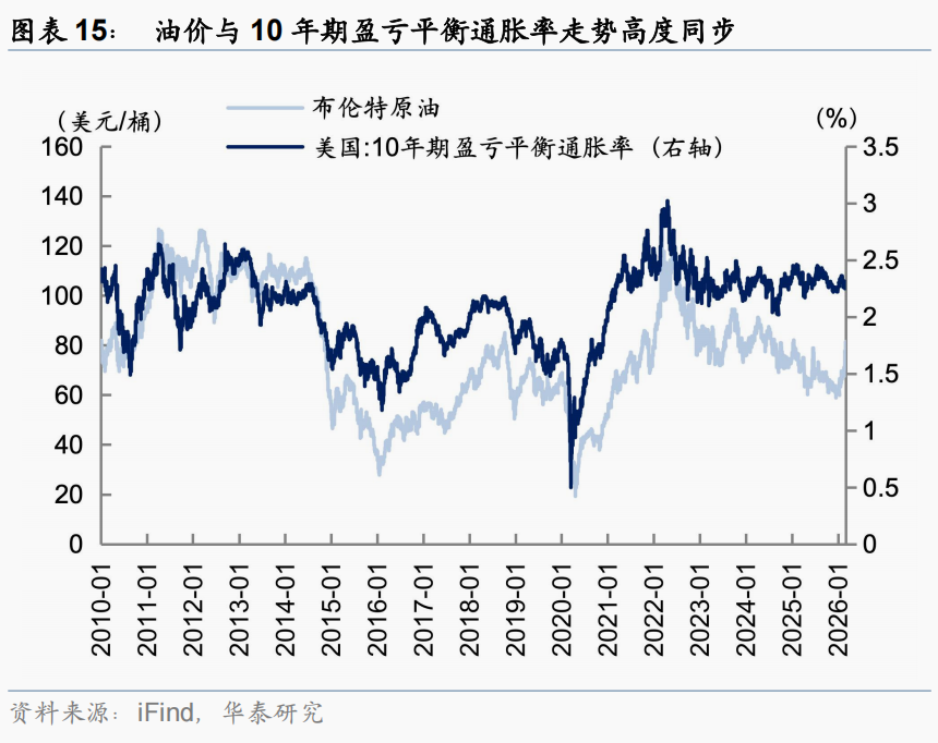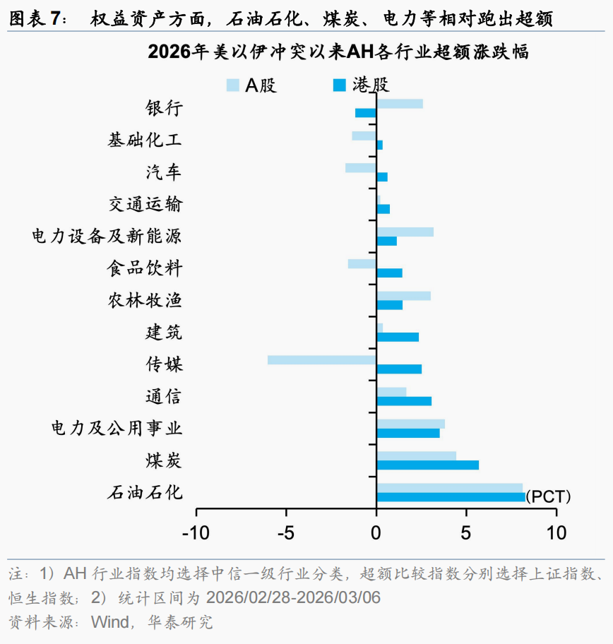 全球股市在本次地缘冲突后回撤有限,核心支撑在于投资者抄底意愿相对强烈。1)盘面上看,上周三(3月4日)后,纳斯达克、恒生科技与创业板指等主要科技指数普遍强势反弹,市场成交额同步放大,逢低买入行为集中;2)资金流上看,以港股市场为例,截至上周三,EPFR外资净流入境外中资股18.5亿美元,规模仍维持近月高位;同口径下南向资金净流入37.7亿美元,环比由负转正且幅度显著,表明境内外投资者在上周前半周均将此次下跌视为配置机会,场内资金的风险偏好并未根本性动摇。 油价上升受益类资产反弹,传统避险资产如瑞郎、黄金表现弱势 2026/02/28以来,部分汇市和油价上升受益类资产有反弹。 货币市场方面,美元指数与比特币领涨全市场,2026/02/28以来分别上涨1.4、2.3%;黄金、瑞郎、欧元、全球国债等传统避险资产表现则相对弱势,分别下跌2.0%、0.9%、1.6%、1.9%。 权益资产方面,石油石化、煤炭、电力及公用事业板块相对跑出超额,港股三者超额收益分别为8.3、5.7、3.5pct,A股三者超额收益分别为8.1、4.4、3.8pct,均为各自市场的前三名。 市场情绪并未到恐慌水平 港股方面,华泰策略情绪指数在冲突升级后维持在50的中性区间上方,并未进入30以下的悲观或恐慌区间,投资者情绪相对稳定;美股方面,VIX-MA20在事件后仅从21.4温和升至29.5,纵向来看也远低于历史上历次地缘危机的高位水平,恐慌情绪并未持续发酵,市场更多以短期扰动而非持久冲击来定价此次事件。 整体来看,投资者并未大幅减仓高估值资产或滞胀受损资产,相比之下选择了加配一些对冲性资产。换言之,投资者普遍将当前的地缘冲突定性为短期事件性冲击,并未计价油价会持续性维持在中高水平,因此市场整体情绪未陷入恐慌,风险资产抛压有限。 在这种定价背景下,市场上下行风险是不对称的。1)如果地缘冲突确实在月内维度结束,这基本符合市场的预期,并没有大幅超过预期。在这种情形下首先投资者仓位本身偏重,其次就算风险资产价格修复,程度也不高。3月4-6日,除纳斯达克外,其余成长股指数大幅反弹,韩国综指、日经225、恒生科技、创业板指累计上涨9.6%、2.5%、2.4%、2.1%,分别修复了2月28日以来下跌的91.4、46.2、66.0、83.9%。2)但如果油价维持高位的时间超过预期,市场面对的重配置空间则会较大,我们在第二章对油价80美元/桶和100美元/桶时对跨国别和跨行业资产的影响进行测算。 跨国比较下的赢家和输家 估值端流动性和成本敏感的市场压力更大 股票估值的分母端主要由无风险利率和股权风险溢价构成,油价上行通常会通过推高通胀预期带动无风险利率上升,同时提升市场风险补偿要求,从而对股票估值形成压制。在两种情形下,结合宏观和策略组的测算,1)若油价在80美元/桶,10年美债利率上升7.5bps,美元上升0.63%-2.24%;若油价在100美元/桶,10年美债利率上升24bps,美元上升1.22%-3.52%。2)风险溢价,地缘冲突会通过风险偏好恶化推高股权风险溢价,从而进一步压缩股票估值。 以标普500指数为例,估值回撤中枢在两种情形下分别为5.6%和10.8%;最大回撤的压力情形下可能更高。对其他市场而言,估值更高、杠杆更高的市场估值下调风险更大,新兴市场压力相对更高。 首先是无风险利率,油价上升将推高美国通胀水平,并通过通胀预期渠道带动无风险利率上行。油价对CPI的影响主要通过能源分项传导,两者走势长期高度相关,但传导并非一比一。历史估计显示,油价同比每上涨10%,大致会带动CPI能源分项上涨约2.7%。相比之下,油价对核心通胀的传导较弱且存在明显时滞,通常需要1—2年才逐渐体现。由于能源在美国CPI中的权重约为6.5%,整体来看,油价同比每上涨10%,大致会推高美国CPI约0.175个百分点。在此基础上,以2025年全年油价均值约70美元/桶为基准,对不同油价情景下的通胀路径进行估算。若2026年油价维持在80美元/桶,相当于较去年上涨约14.3%,将带动能源分项对CPI的直接贡献约0.25个百分点,使2026年CPI同比中枢上升至约3.55%;若油价维持在100美元/桶,相当于较去年上涨约42.9%,能源分项对CPI的直接贡献约0.75个百分点,将2026年CPI同比中枢抬升至约4.05%。 10年期美债收益率可以拆解为10年期盈亏平衡通胀率和10年期实际利率(以10年期TIPS利率作为代理变量)两部分。 油价上涨直接推升市场对未来通胀的预期,进而推高盈亏平衡通胀率,实际利率的走势则相对滞后。实证回归结果显示,在货币政策路径未发生明显变化的短期内,油价每上涨1%,10年期盈亏平衡通胀率约上升0.58bps。而实际利率主要取决于宏观经济基本面与货币政策立场,因此油价冲击在初期对实际利率的影响较为有限。 然而,若油价上涨具有持续性,并开始实质性地改变货币政策路径,则实际利率亦将随之上行,只是在节奏上明显滞后通胀预期。2022年即为典型案例:油价自2020年起持续走高,通胀预期随之抬升,但实际利率在联储正式启动加息周期前始终受到压制,直至2022年加息落地后才显著上行。因此,在评估油价上涨对美债利率的影响时,需区分两个阶段:短期内以通胀预期上行为主;但若油价高位持续至年底,通胀压力持续积累并开始实质性影响市场对货币政策路径的定价,则实际利率亦存在跟随上行的风险。 从实证估算来看,在货币政策路径未发生实质性转变的短期内,油价每上涨1%,10年期美债利率中枢上行约0.58 bps。以2026年2月27日布伦特原油70.84美元/桶为基