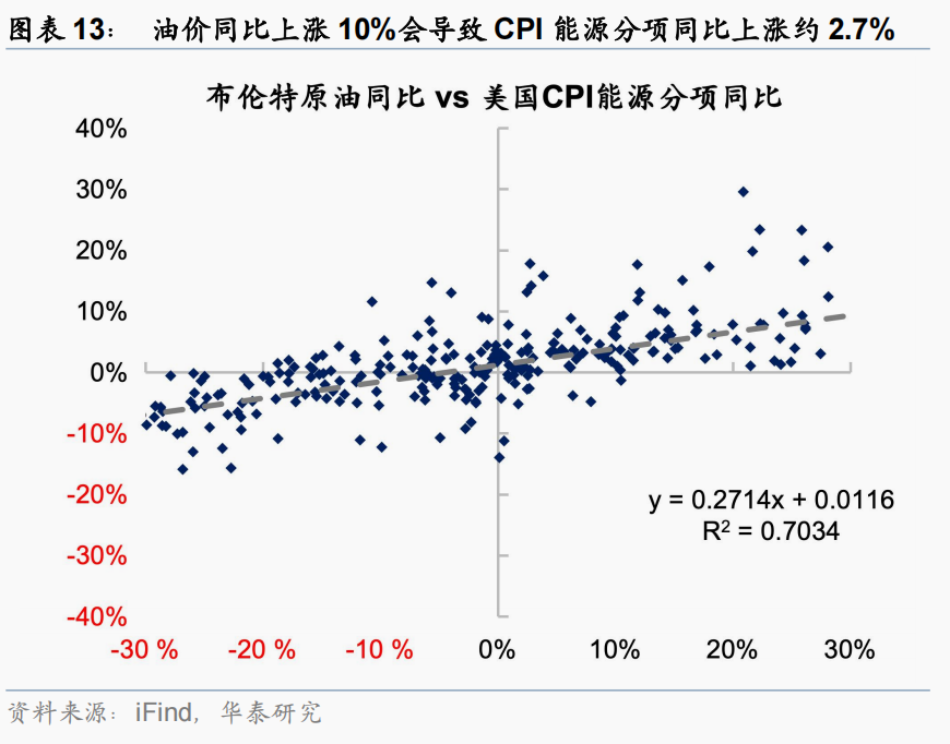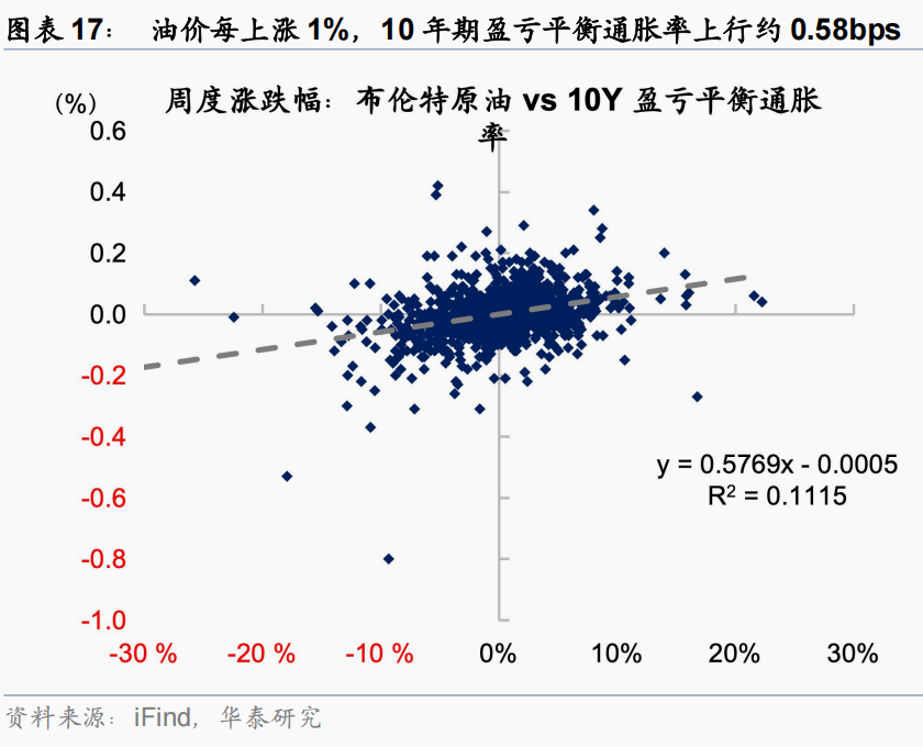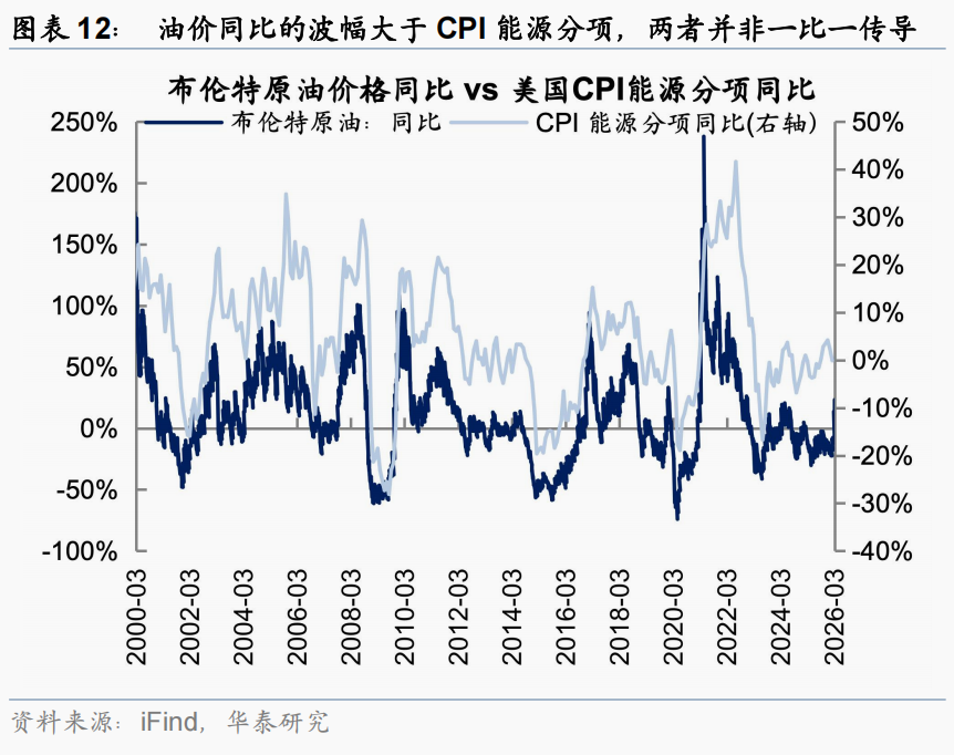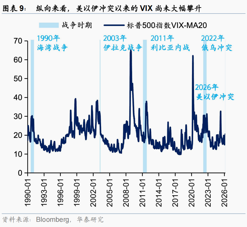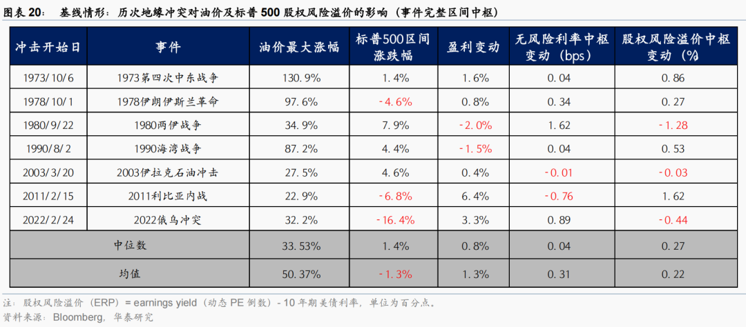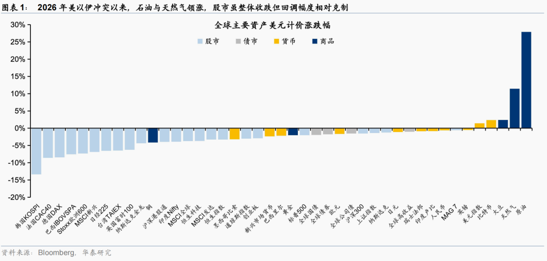 全球股市在本次地缘冲突后回撤有限,核心支撑在于投资者抄底意愿相对强烈。1)盘面上看,上周三(3月4日)后,纳斯达克、恒生科技与创业板指等主要科技指数普遍强势反弹,市场成交额同步放大,逢低买入行为集中;2)资金流上看,以港股市场为例,截至上周三,EPFR外资净流入境外中资股18.5亿美元,规模仍维持近月高位;同口径下南向资金净流入37.7亿美元,环比由负转正且幅度显著,表明境内外投资者在上周前半周均将此次下跌视为配置机会,场内资金的风险偏好并未根本性动摇。 油价上升受益类资产反弹,传统避险资产如瑞郎、黄金表现弱势 2026/02/28以来,部分汇市和油价上升受益类资产有反弹。 货币市场方面,美元指数与比特币领涨全市场,2026/02/28以来分别上涨1.4、2.3%;黄金、瑞郎、欧元、全球国债等传统避险资产表现则相对弱势,分别下跌2.0%、0.9%、1.6%、1.9%。 权益资产方面,石油石化、煤炭、电力及公用事业板块相对跑出超额,港股三者超额收益分别为8.3、5.7、3.5pct,A股三者超额收益分别为8.1、4.4、3.8pct,均为各自市场的前三名。 市场情绪并未到恐慌水平 港股方面,华泰策略情绪指数在冲突升级后维持在50的中性区间上方,并未进入30以下的悲观或恐慌区间,投资者情绪相对稳定;美股方面,VIX-MA20在事件后仅从21.4温和升至29.5,纵向来看也远低于历史上历次地缘危机的高位水平,恐慌情绪并未持续发酵,市场更多以短期扰动而非持久冲击来定价此次事件。 整体来看,投资者并未大幅减仓高估值资产或滞胀受损资产,相比之下选择了加配一些对冲性资产。换言之,投资者普遍将当前的地缘冲突定性为短期事件性冲击,并未计价油价会持续性维持在中高水平,因此市场整体情绪未陷入恐慌,风险资产抛压有限。 在这种定价背景下,市场上下行风险是不对称的。1)如果地缘冲突确实在月内维度结束,这基本符合市场的预期,并没有大幅超过预期。在这种情形下首先投资者仓位本身偏重,其次就算风险资产价格修复,程度也不高。3月4-6日,除纳斯达克外,其余成长股指数大幅反弹,韩国综指、日经225、恒生科技、创业板指累计上涨9.6%、2.5%、2.4%、2.1%,分别修复了2月28日以来下跌的91.4、46.2、66.0、83.9%。2)但如果油价维持高位的时间超过预期,市场面对的重配置空间则会较大,我们在第二章对油价80美元/桶和100美元/桶时对跨国别和跨行业资产的影响进行测算。 跨国比较下的赢家和输家 估值端流动性和成本敏感的市场压力更大 股票估值的分母端主要由无风险利率和股权风险溢价构成,油价上行通常会通过推高通胀预期带动无风险利率上升,同时提升市场风险补偿要求,从而对股票估值形成压制。在两种情形下,结合宏观和策略组的测算,1)若油价在80美元/桶,10年美债利率上升7.5bps,美元上升0.63%-2.24%;若油价在100美元/桶,10年美债利率上升24bps,美元上升1.22%-3.52%。2)风险溢价,地缘冲突会通过风险偏好恶化推高股权风险溢价,从而进一步压缩股票估值。 以标普500指数为例,估值回撤中枢在两种情形下分别为5.6%和10.8%;最大回撤的压力情形下可能更高。对其他市场而言,估值更高、杠杆更高的市场估值下调风险更大,新兴市场压力相对更高。 首先是无风险利率,油价上升将推高美国通胀水平,并通过通胀预期渠道带动无风险利率上行。油价对CPI的影响主要通过能源分项传导,两者走势长期高度相关,但传导并非一比一。历史估计显示,油价同比每上涨10%,大致会带动CPI能源分项上涨约2.7%。相比之下,油价对核心通胀的传导较弱且存在明显时滞,通常需要1—2年才逐渐体现。由于能源在美国CPI中的权重约为6.5%,整体来看,油价同比每上涨10%,大致会推高美国CPI约0.175个百分点。在此基础上,以2025年全年油价均值约70美元/桶为基准,对不同油价情景下的通胀路径进行估算。若2026年油价维持在80美元/桶,相当于较去年上涨约14.3%,将带动能源分项对CPI的直接贡献约0.25个百分点,使2026年CPI同比中枢上升至约3.55%;若油价维持在100美元/桶,相当于较去年上涨约42.9%,能源分项对CPI的直接贡献约0.75个百分点,将2026年CPI同比中枢抬升至约4.05%。 10年期美债收益率可以拆解为10年期盈亏平衡通胀率和10年期实际利率(以10年期TIPS利率作为代理变量)两部分。 油价上涨直接推升市场对未来通胀的预期,进而推高盈亏平衡通胀率,实际利率的走势则相对滞后。实证回归结果显示,在货币政策路径未发生明显变化的短期内,油价每上涨1%,10年期盈亏平衡通胀率约上升0.58bps。而实际利率主要取决于宏观经济基本面与货币政策立场,因此油价冲击在初期对实际利率的影响较为有限。 然而,若油价上涨具有持续性,并开始实质性地改变货币政策路径,则实际利率亦将随之上行,只是在节奏上明显滞后通胀预期。2022年即为典型案例:油价自2020年起持续走高,通胀预期随之抬升,但实际利率在联储正式启动加息周期前始终受到压制,直至2022年加息落地后才显著上行。因此,在评估油价上涨对美债利率的影响时,需区分两个阶段:短期内以通胀预期上行为主;但若油价高位持续至年底,通胀压力持续积累并开始实质性影响市场对货币政策路径的定价,则实际利率亦存在跟随上行的风险。 从实证估算来看,在货币政策路径未发生实质性转变的短期内,油价每上涨1%,10年期美债利率中枢上行约0.58 bps。以2026年2月27日布伦特原油70.84美元/桶为基