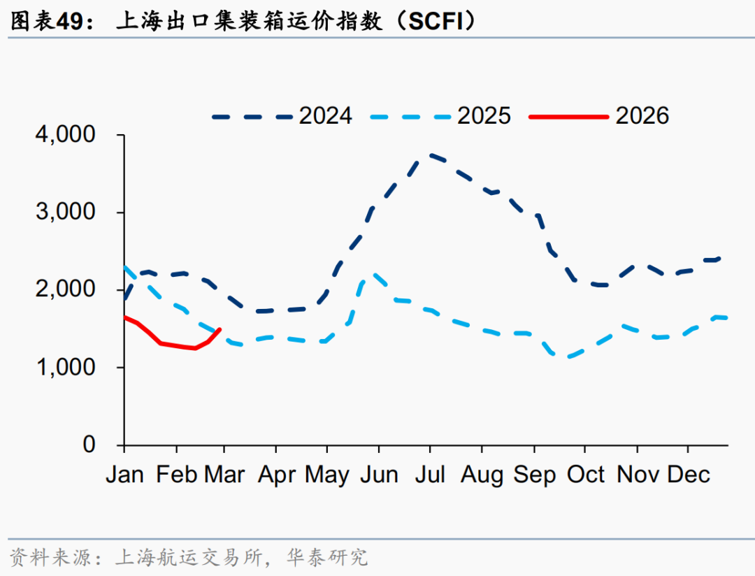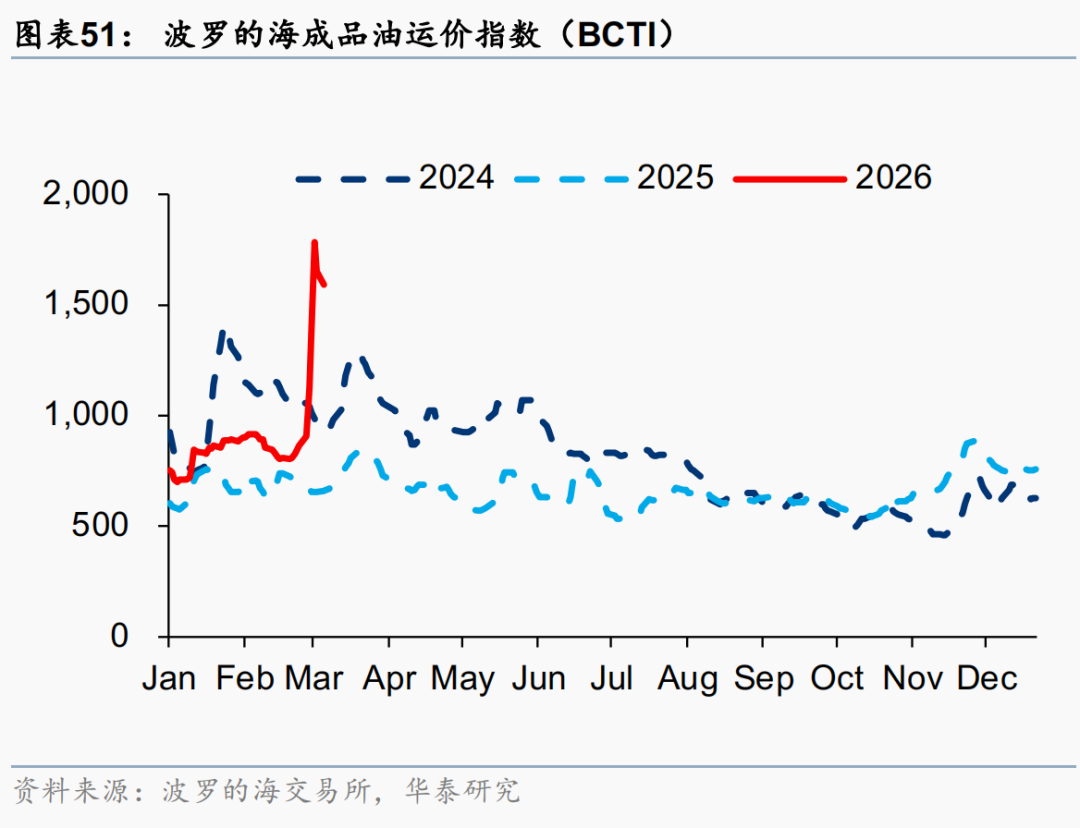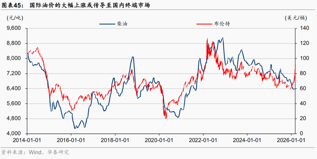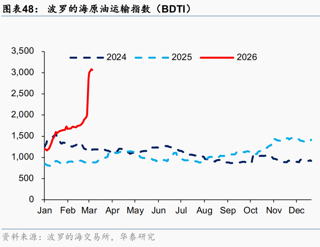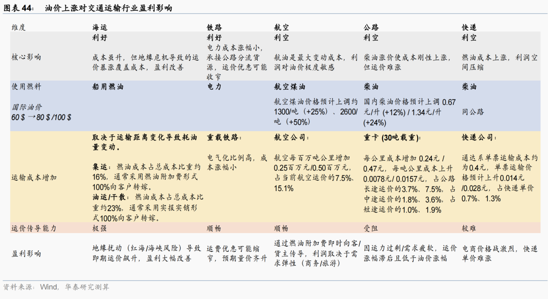 交通运输:油价上行对交运各子板块的影响呈现显著非对称性。航空因燃油附加费机制及当前供需改善阶段具备较强传导能力,油价从60美元/桶升至80美元/桶、100美元/桶对应运价涨幅约7.5%/15.1%,成本压力可部分转嫁;公路货运因运力过剩、需求偏弱,传导机制受阻;快递因价格竞争激烈,燃油成本难以顺价。与之相对,海运和铁路则是本轮油价上行的主要受益方——地缘冲突推动BDTI/SCFI短期大幅上行,集运与油运通过燃油附加费或实报实销形式实现100%成本转嫁,盈利弹性显著;铁路则受益于公路分流及煤炭“西煤东运”需求,运费优惠空间有望收窄,量价双升可期。