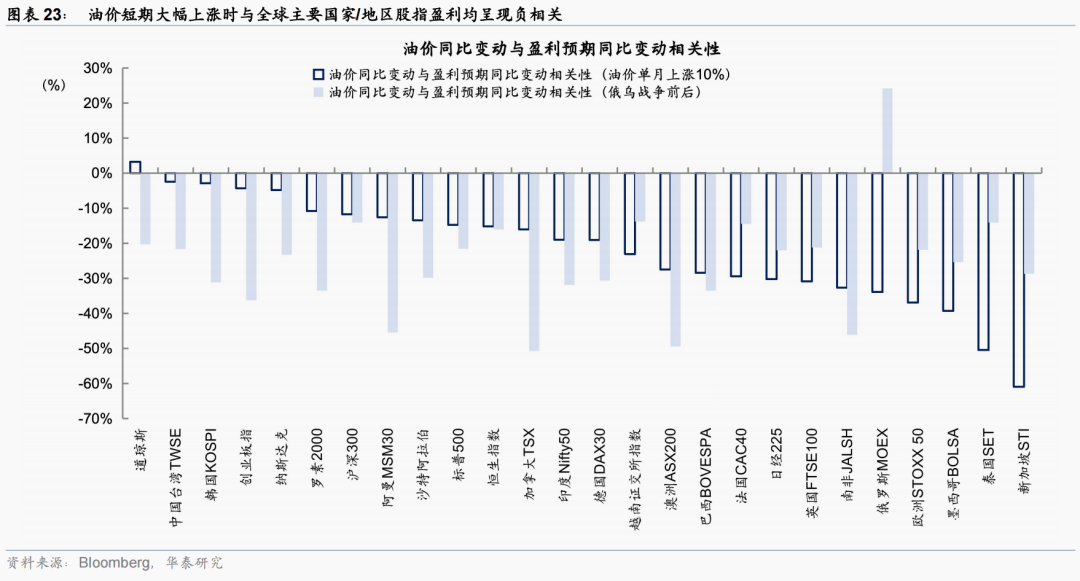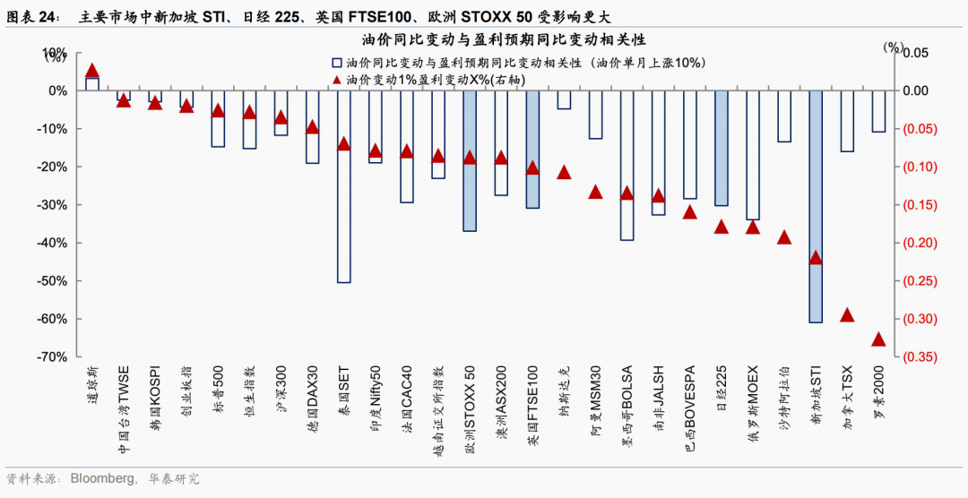 但分子的区别会更大,不同国家股指的盈利结构对油价上升的敏感度不同。我们测算当油价单月走高超过10%时,中国整体及美国市场主要股指受影响程度相对更小,新加坡、日本等亚洲外向型经济体、英国、欧洲整体股指盈利下修较为明显。
