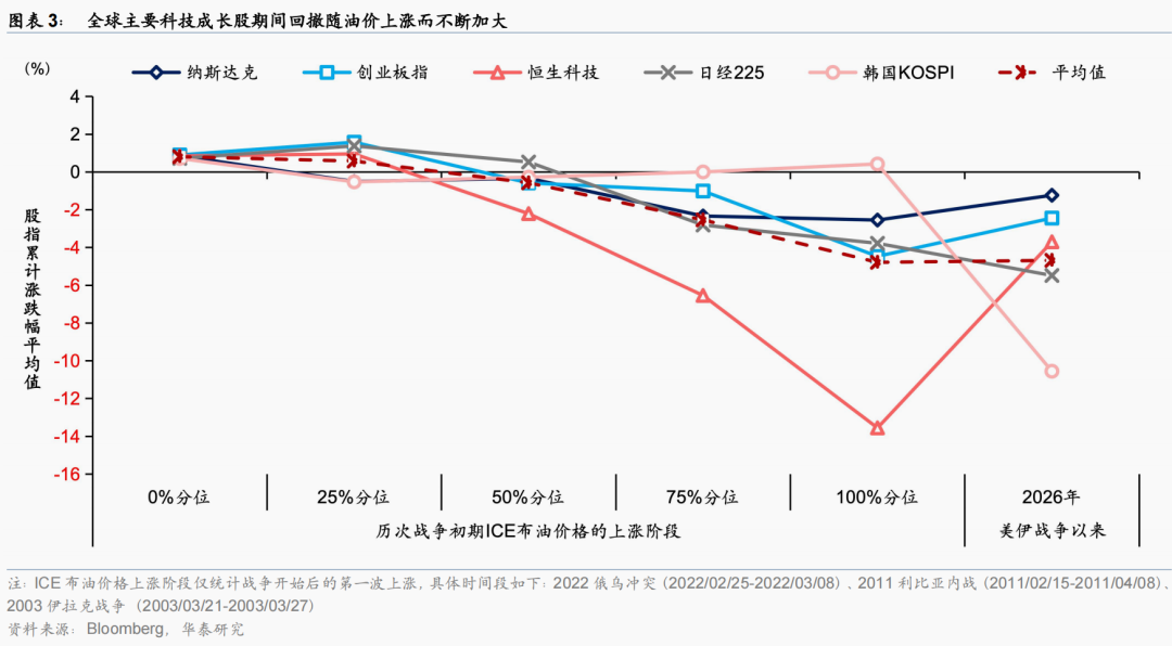聚焦于流动性敏感的科技成长股,除韩国市场回撤幅度较大之外,大多数科技成长板块回撤程度有限。我们统计了2003年以来历次冲突时期布伦特原油价格的主升浪区间,将原油价格的上涨区间划分为25/50/75/100四个分位点,分别统计全球五大主要科技成长指数的区间累计涨跌幅均值情况。整体来看,五大指数在25/50/75/100四个分位点的涨跌幅均值分别为0.6%、-0.6%、-2.5%、-4.8%,且恒生科技的回撤幅度相对较大,全区间回撤均值达13.6%。2026年美以伊冲突以来,原油上涨27.9%,大幅高于历史均值23.8%,但目前科技股的下跌幅度并不算深,除韩国综指下跌幅度较大外,其余指数的回撤幅度均处于历史上布油价格上涨中期水平,回撤幅度相对有限。