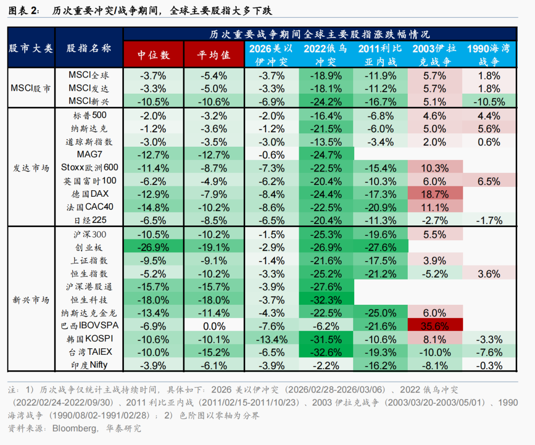 纵向来看,本次市场的负面反应相对温和,未出现历史同等级别的恐慌性抛售。我们复盘了1990年以来历次重要的地缘冲突背景下,全球主要股市的回撤情况。整体来看,历次重要冲突期间,全球主要股指大多下跌,MSCI全球指数涨跌幅中位数为-3.7%,2022年俄乌冲突期间跌幅-18.9%。相比之下,2026年美以伊冲突后,MSCI全球指数仅回撤3.7%,发达市场与新兴市场指数的回撤幅度也均显著低于历史均值与2022年的水平。整体来看,本次市场的负面反应相对温和,未出现历史同等级别的恐慌性抛售。