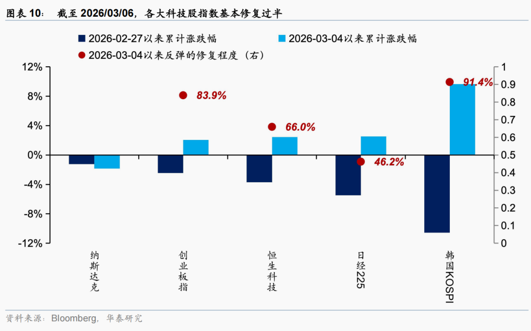 横向来看,风险资产调整但程度都比较有限。自2026年2月28日美以伊紧张局势急剧升级以来,以原油为代表的大宗商品大幅上涨。截至2026年3月6日,原油、天然气分别上涨27.9、11.4%。但相比于石油天然气的大幅上涨,股市虽然整体收跌,但全球股市涨跌幅中位数仅为-3.9%,回调幅度相对克制。结构上看,流动性敏感和高估值的成长板块回调亦相对有限,纳斯达克、创业板指、恒生科技指数仅分别下跌1.2%、2.9%、3.7%。