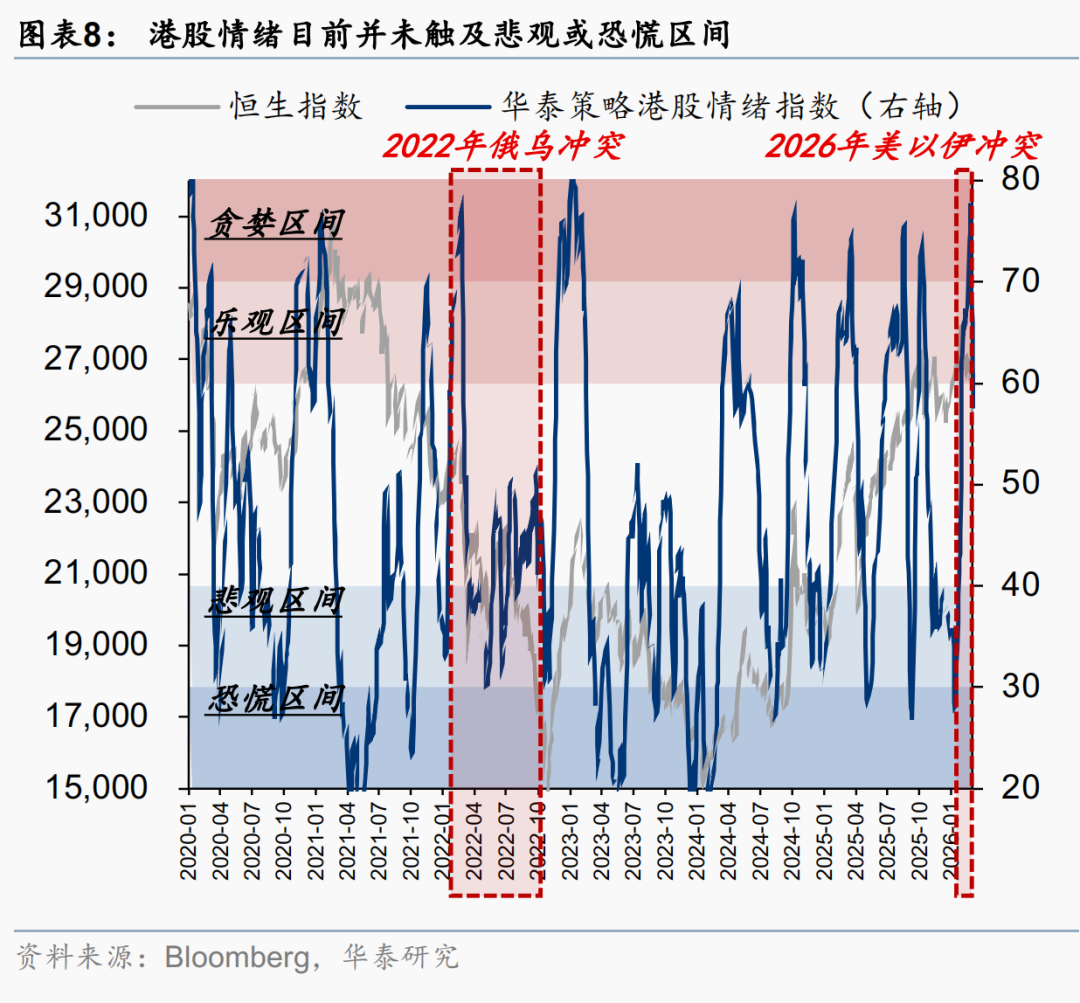 1)流动性敏感和高估值资产回调程度普遍有限。科技成长股如纳斯达克、日经225、韩国KOSPI、创业板指、港股科技上周回撤1.2、6.5、13.4、2.9、3.7%,投资者“抄底”意愿较强,周内还有反弹。2)油价上升受益类资产上涨,原油、美元分别上涨27.9%、1.4%,但传统避险类资产如瑞郎和黄金表现不佳。3)从美股VIX和港股情绪指标看,市场并未到恐慌水平。