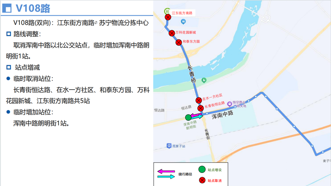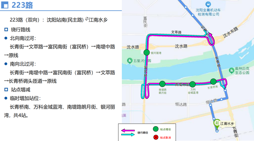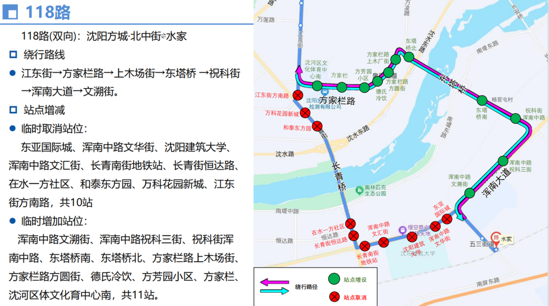 由长青街经南堤中路、河畔西街至富民街回原线,临时取消文化东路丰乐一街、东北大学沈河校区、摩托车城、丰乐二街文萃路、文萃路长青街、长青街文化东路、万科花园新城、和泰东方园等8个站位,临时增设长青桥南、万科金域蓝湾、南堤路朗月街、银河丽湾等4个站位。