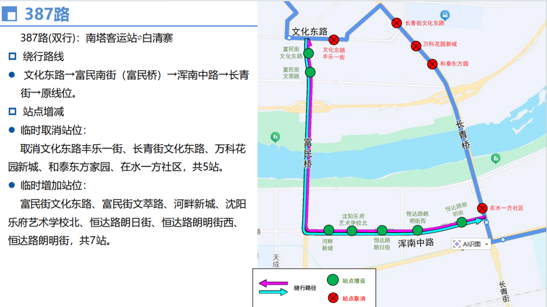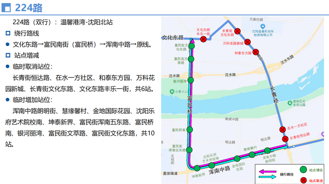 由长青街经恒达路、富民街至文化东路回原线,临时取消和泰东方园、万科花园新城、长青街文化东路、文化东路丰乐一街、在水一方社区等5个站位,临时增设恒达路朗明街、恒达路朗明街西、恒达路朗日街、沈阳乐府艺术学校北、河畔新城、富民街文萃路、富民街文化东路等7个站位。