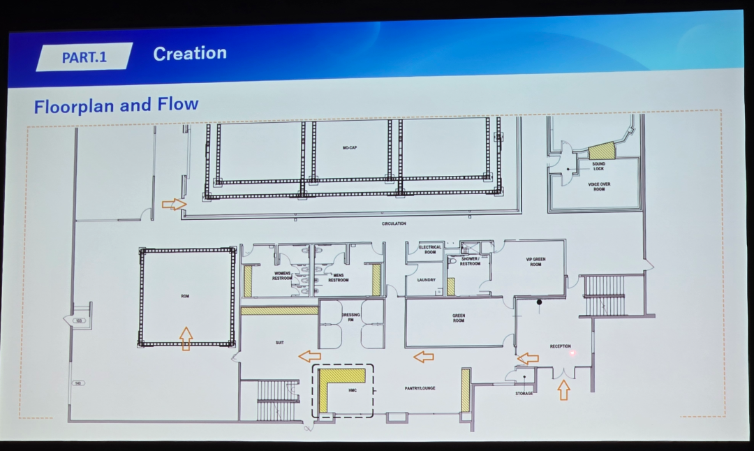 接下来,我将展示我们的平面布局图。我想特别指出的一点是,我们的动线设计是专门为动作捕捉流程优化的。