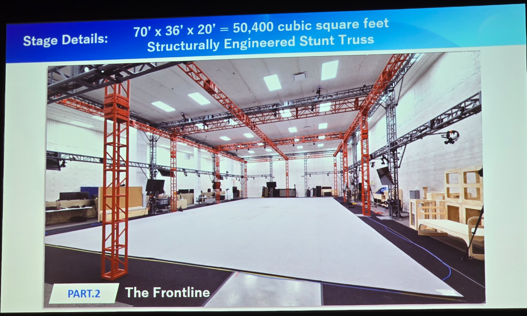 接下来让我们谈谈技术,以及舞台上的实际情况。我们的舞台横跨两层楼,总面积超过 5 万立方英尺,是美国最大的动作捕捉棚之一。虽然我不敢断言它是全美最大,但很可能是洛杉矶最大的。舞台墙壁覆盖着隔音材料,并配备了静音空调系统,以确保在如此巨大的空间中依然能够获得理想的音质效果。