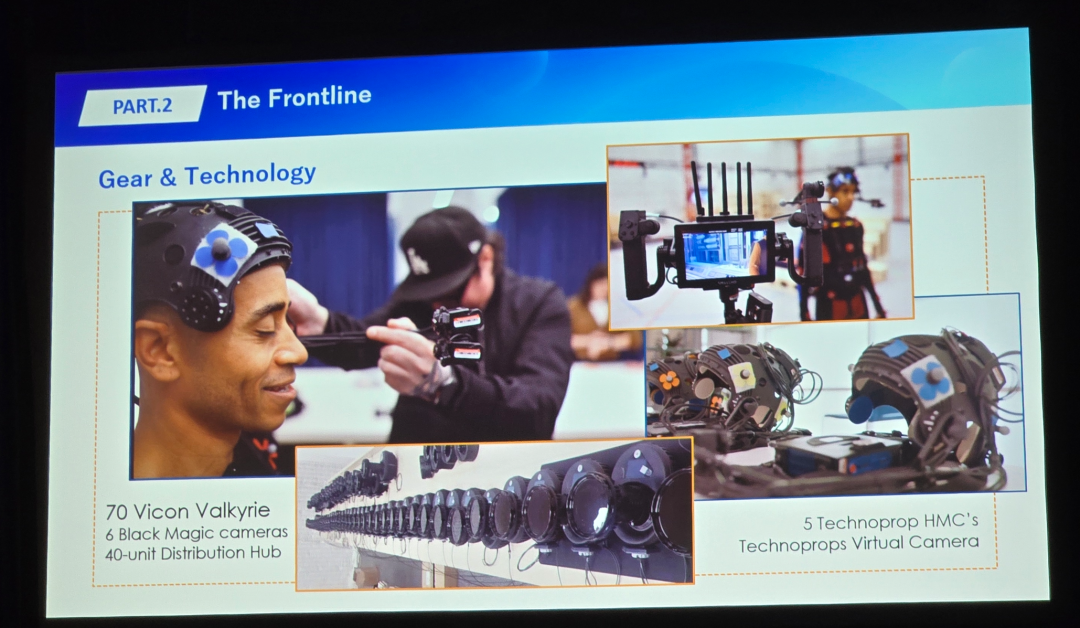 接下来简要介绍一下我们的设备。我们配备了 Vicon 最新的动作捕捉技术,包括约 70 台 Vicon Valkyrie 动补摄影机、6 台 Blackmagic 摄影机以及 40 个单元的分发枢纽。这意味着我们可以将任意摄像机部署到舞台的各个位置,甚至连接到录音棚;录音棚内的一些电视屏幕也直接接入了舞台摄像机信号。