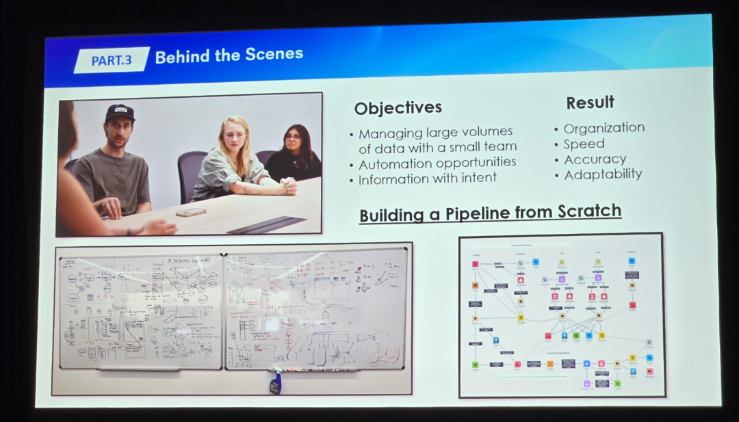 在搭建这个舞台的过程中,由于时间非常紧迫,我们确立了几个核心目标:用小团队管理海量数据、实现自动化和管线优化,以及有意图地管理信息。这些目标在最终构建的管线中发挥了关键作用。