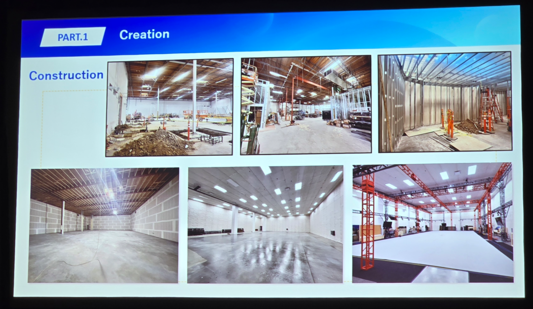 我将从建设阶段讲起。我们的起点是这个宽敞的仓库(左上)。能够参与整个搭建过程令人非常震撼。我大学时主修建筑,后来转向动画领域,而参与建设阶段的经历恰好将我所有的兴趣与技能汇聚在一起,这对我来说意义非凡。
