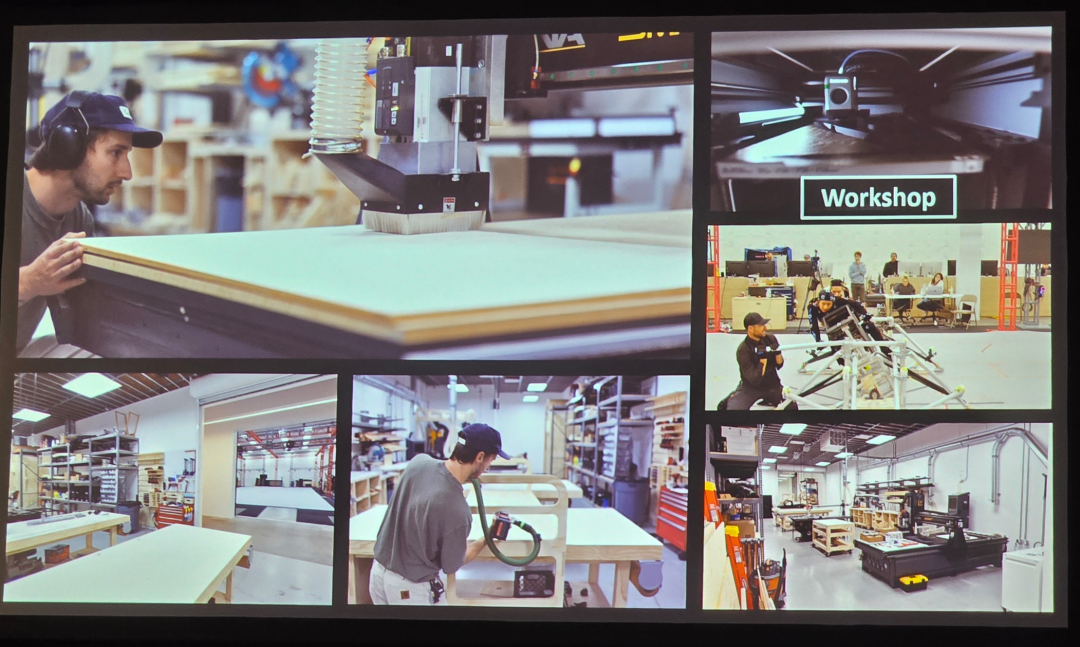 接下来,我想谈谈我们的工作间,这是我最喜欢的房间之一。我本人也做过一些施工工作,因此看到这样一个功能强大、专门为舞台服务的工作空间让我非常兴奋。这个工作室面积为 15000 平方英尺。我们拥有一台 CNC 机床,可以切割出非常精确的曲线,并能处理 4×8 英尺的大块胶合板。
