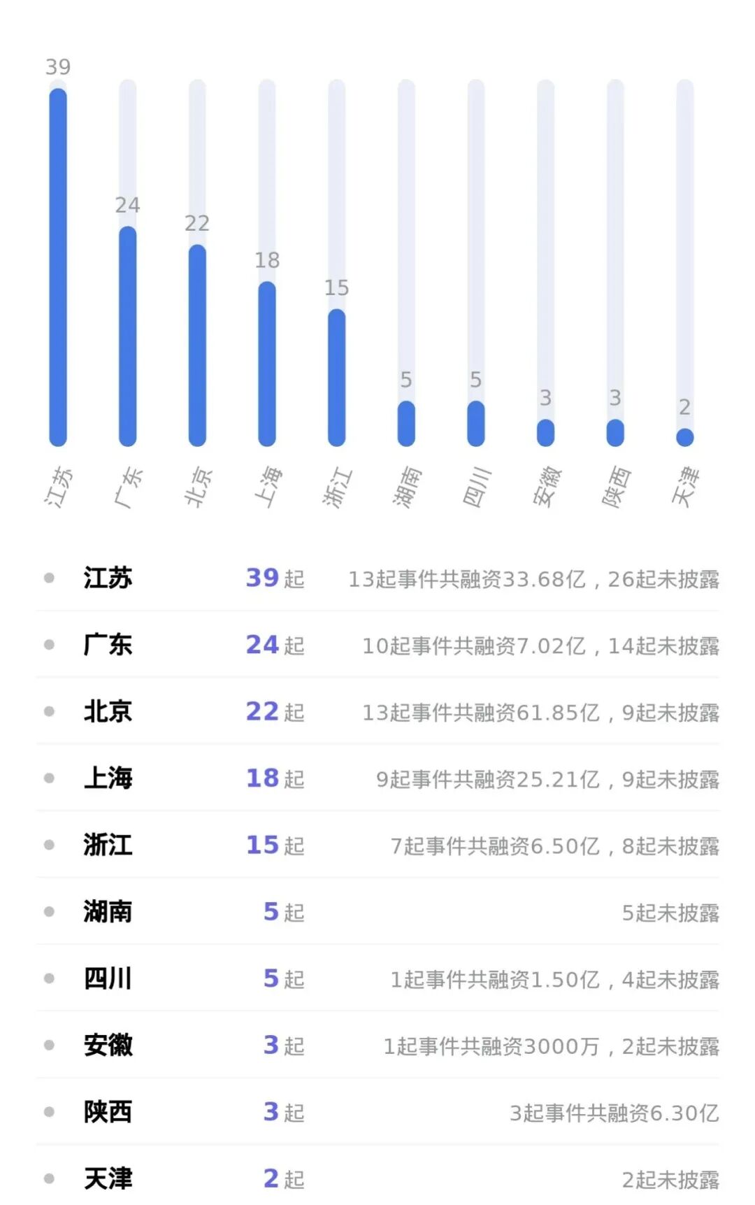 从本周披露获投企业的地区分布来看,主要集中在江苏、广东、北京。其中江苏披露39个,广东披露24个,北京披露22个。