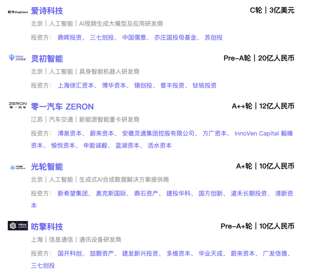 从已披露金额事件的融资规模来看,人工智能最高,融资总规模约为87.14亿元人民币。其中AI视频生成大模型及应用研发商 “爱诗科技” 获3亿美元 C轮融资。
