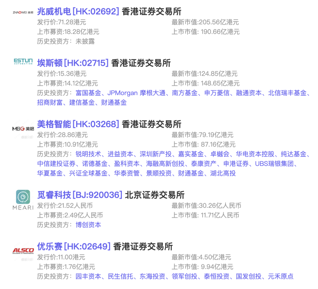 5家上市公司中,有4家曾获VC/PE或CVC投资,其中“埃斯顿”曾获财通基金、JPMorgan 摩根大通、招商财富投资;“美格智能”曾获财通基金、诺德基金、UBS瑞银集团投资;“觅睿科技”曾获博创资本投资。