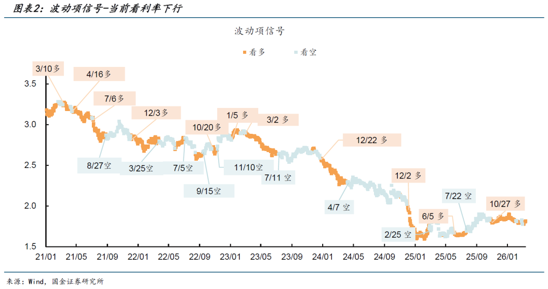 2026年:年初至1月18日,模型总信号延续去年12月末的看震荡信号,趋势看空、波动指标看多;而后1月19日,趋势指标转为看多,2月3日波动信号转空,2月9日波动信号恢复看多,2月25日波动信号转为看空,而后波动信号于3月3日转多,当前模型总信号看利率下行。