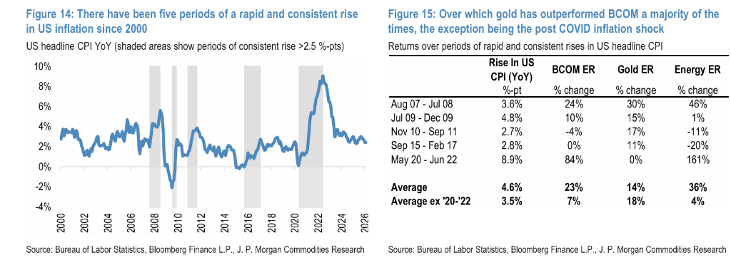 其一是通胀对冲价值。该行梳理了自2000年以来美国CPI快速持续上涨超过2.5个百分点的五个历史时期:除2020年至2022年疫情后通胀周期外,其余四个时期黄金均录得两位数涨幅,且均跑赢大宗商品综合指数(BCOM)。疫情后通胀系需求正向冲击与供应链受限叠加所致,大宗商品整体涨幅远超黄金,属特殊情形。摩根大通认为,若此次油价冲击演变为滞涨环境,黄金的通胀对冲价值将更加突出。