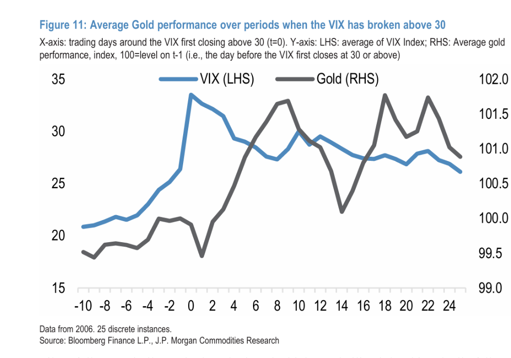 值得注意的是,在上述25个事件中,有22个事件的VIX均在约10至15个交易日内回落至30以下。摩根大通强调,VIX的运动方向至关重要——在高位且下行的VIX环境下,黄金历史上表现最为强劲,与高位且上行时的最弱表现形成鲜明对比,凸显了VIX走势方向作为金价短期战术信号的关键意义。
