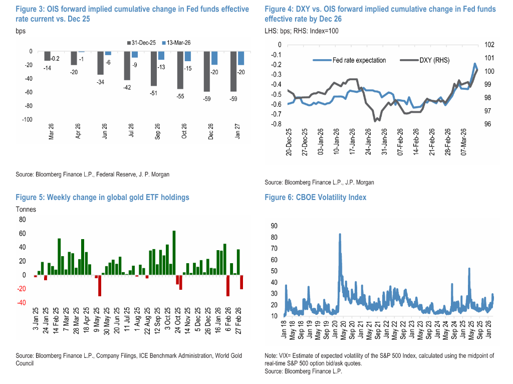 摩根大通指出,本轮黄金抛售由多重因素叠加驱动:能源价格飙升推高通胀预期,促使市场大幅压低对美联储降息的预期,叠加美元急速反弹,形成近期的直接利空背景。然而,该行认为最主要的推手是股市波动加剧引发的广泛去风险化——当VIX指数高企并持续攀升时,投资者在保证金追缴、组合再平衡和VaR冲击的叠加压力下被迫全面筹措流动性,黄金持仓首当其冲遭到抛售,全球黄金ETF持仓上周随之出现明显流出。