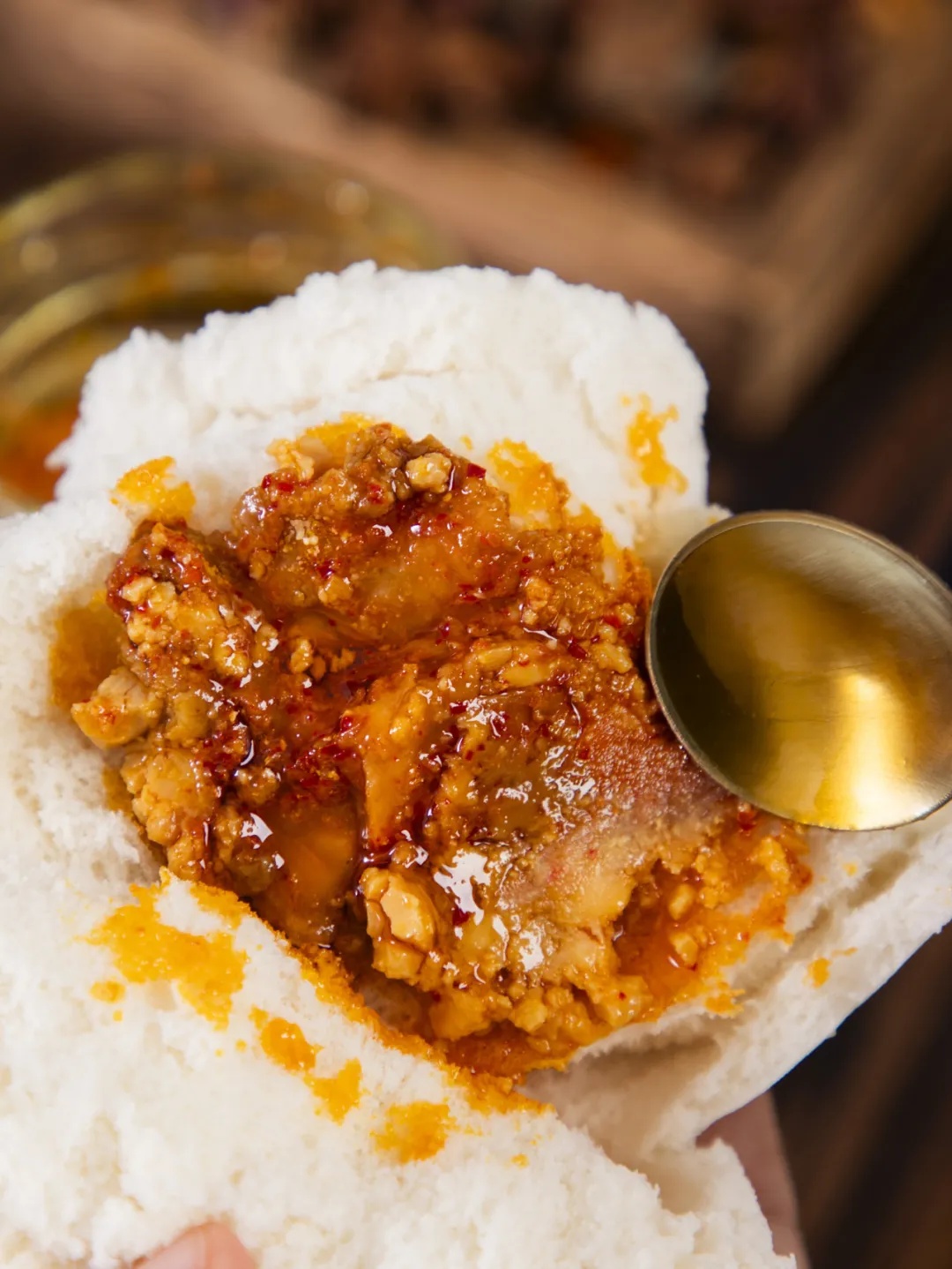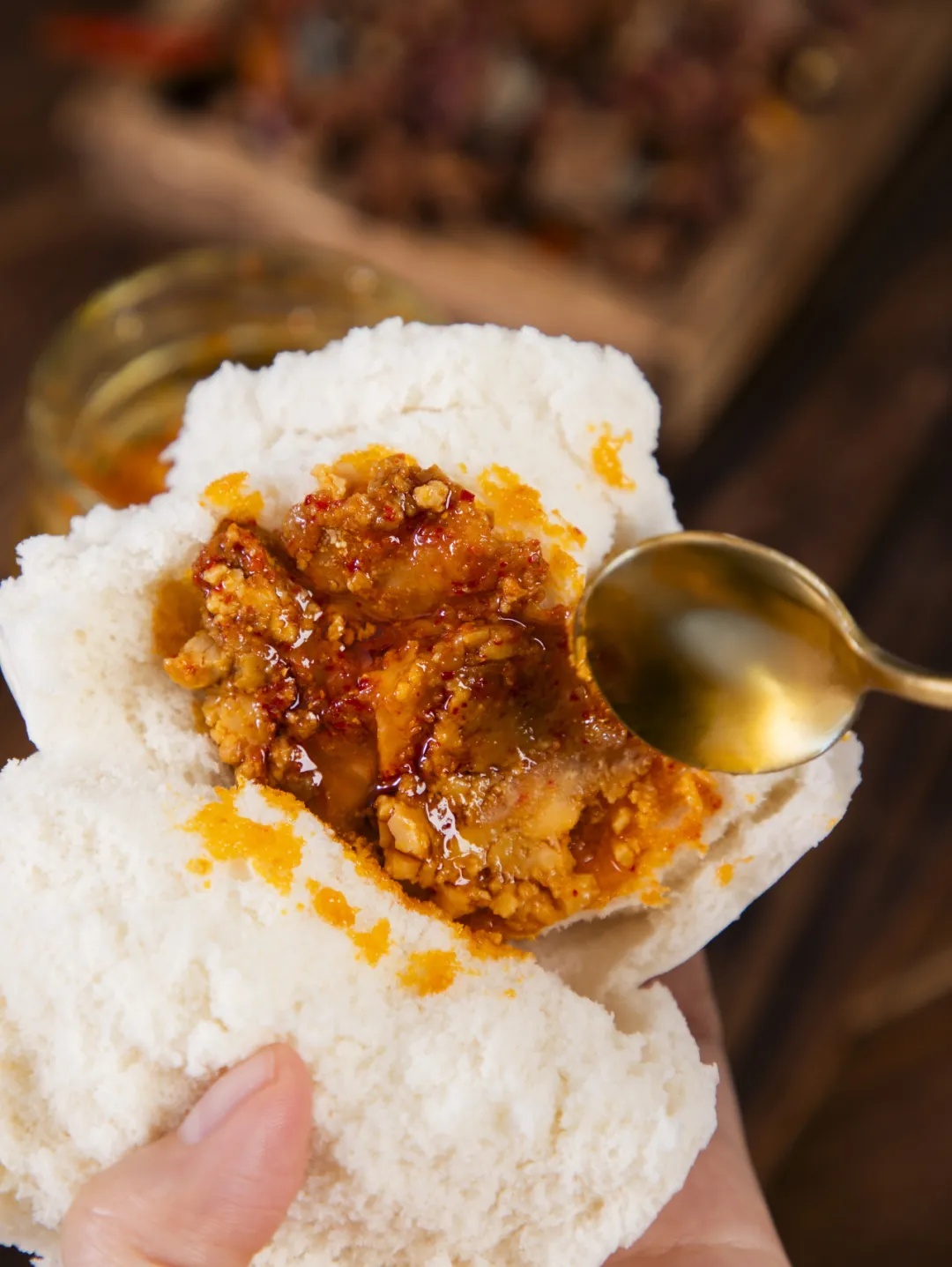 热乎乎的馒头,蘸一点腐乳,再配个鸡蛋,一口下去,腐乳的香和鸡枞的鲜在嘴里爆开!