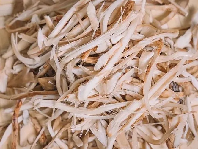 使用瓜叶或竹片,将一根根鸡枞菌反复擦洗三遍以上,再手工沿着鸡枞的根茎纹理手撕成均匀的条状。