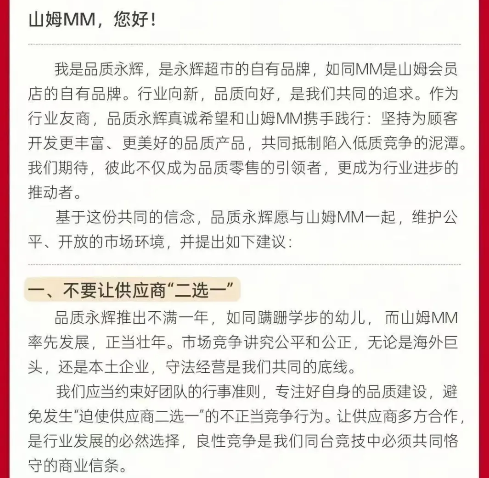 在这封题为《致山姆MM的一封公开信》中,永辉并没有像往常那样谦逊地谈论“对标”与“学习”,而是以近乎“檄文”的姿态,提出了“一不要,六要”的行业倡议。其中最刺眼、也是最核心的诉求直指山姆的命门——“不要让供应商‘二选一’”。