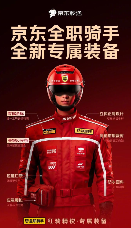 官方介绍,新骑手服采用立体裁剪,更舒适防水面料配高亮反光银条,更安全全职骑手专属工号金标牌。首批新骑手服,将覆盖北上广深全职骑手,即日起均可免费申领。