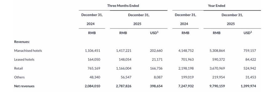 从收入来看,亚朵2025年来自管理加盟酒店的收入约53.09亿元,同比增长27.96%;来自租赁酒店的收入约5.9亿元,同比减少15.9%;零售收入约36.71亿元,同比增长67%;其他收入约2.2亿元,同比增长10.52%。值得一提的是,2025年亚朵来自零售收入占净收入的占比约41.8%,同比增长5个百分点。