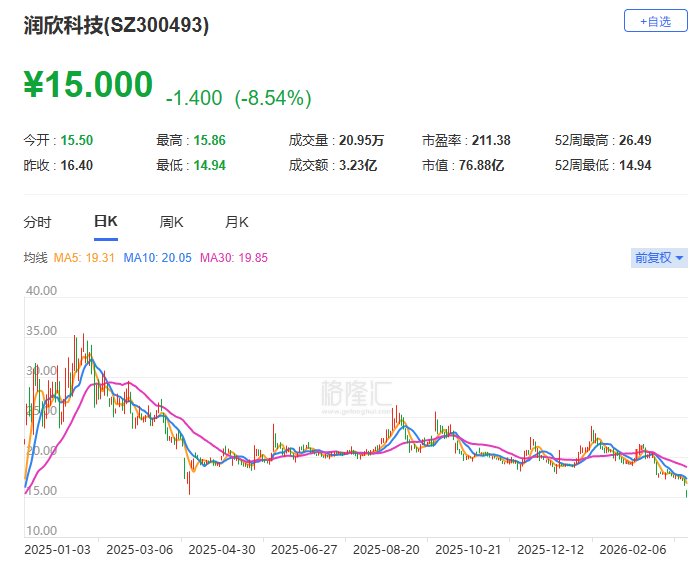 3月23日,润欣科技(300493.SZ)盘中跌8.9%至14.94元,股价创2024年12月11日以来逾15个月新低。